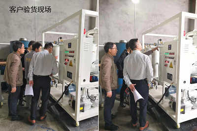 三一集團客戶到工廠驗收雙級真空濾油機,我司針對客戶油品及現場使用環境等情況,做出相應技術修改,客戶認可現場調試驗收合格。